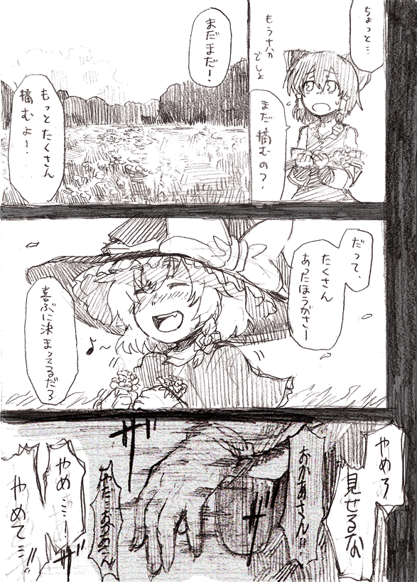 kegya (kagiya hourai), inubashiri momiji, kirisame marisa, touhou, commentary request, highres, partial commentary, 2girls, animal ear fluff, animal ears, apron, battle, black hat, black skirt, black vest, blonde hair, blurry, blurry foreground, bow, breasts, broom, cloud, danmaku, detached sleeves, drooping headgear, feet out of frame, floating hair, frilled skirt, frills, from behind, hat, hat bow, holding, holding broom, holding sword, holding weapon, long hair, long skirt, long sleeves, medium breasts, midair, mini-hakkero, multiple girls, pink background, pom pom (clothes), puffy long sleeves, puffy sleeves, red eyes, red hat, red trim, shirt, short hair, skirt, star (symbol), swept bangs, sword, tail, tokin hat, vest, weapon, white apron, white bow, white hair, white shirt, wide sleeves, witch hat, wolf ears, wolf girl, wolf tail