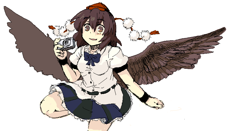 1girlblack wingsbreastsbrown eyesbrown haircamerafemale focusribbonshort hairsimple backgroundskirtsolowhite backgroundwings