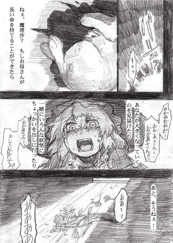 kurona, flandre scarlet, touhou, translated, 1girl, crazy eyes, female focus, frilled vest, frills, greyscale, hair between eyes, hat, mob cap, monochrome, solo, standing, vest, white background