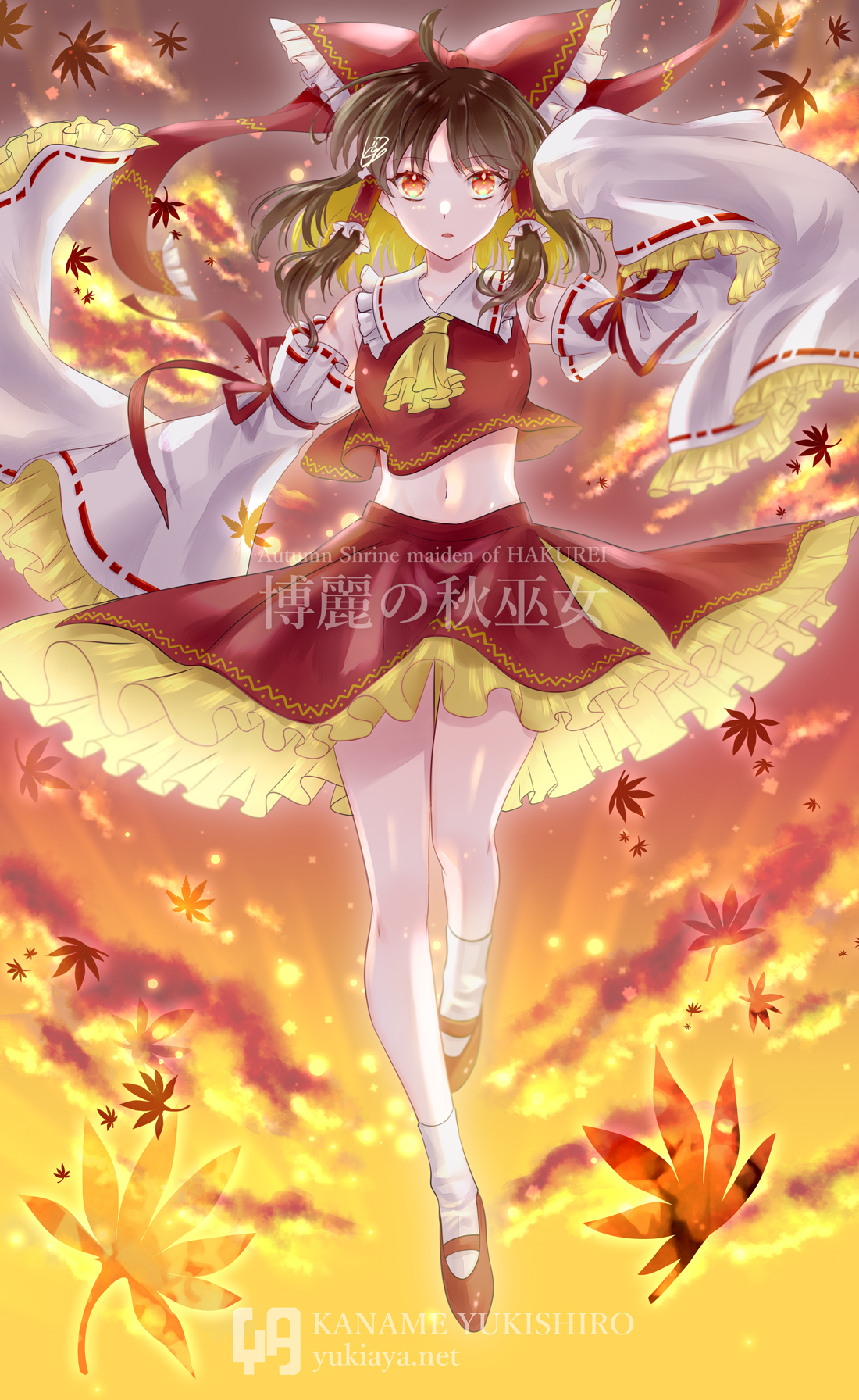 1girlartist nameascotautumn leavesbilingual textbowbrown hairclouddetached sleevesenglish texteveningfalling leavesfrilled bowfrilled hair tubesfrilled skirtfrillsfull bodyhair bowhair tubesleaflong hairlooking at viewermaple leafmary janesmidriffmixed-language textnavelopen mouthred bowred eyesred shoesred skirtribbon trimribbon-trimmed sleevesshoesskirtskirt setsockssolowatermarkwhite socksyellow ascot