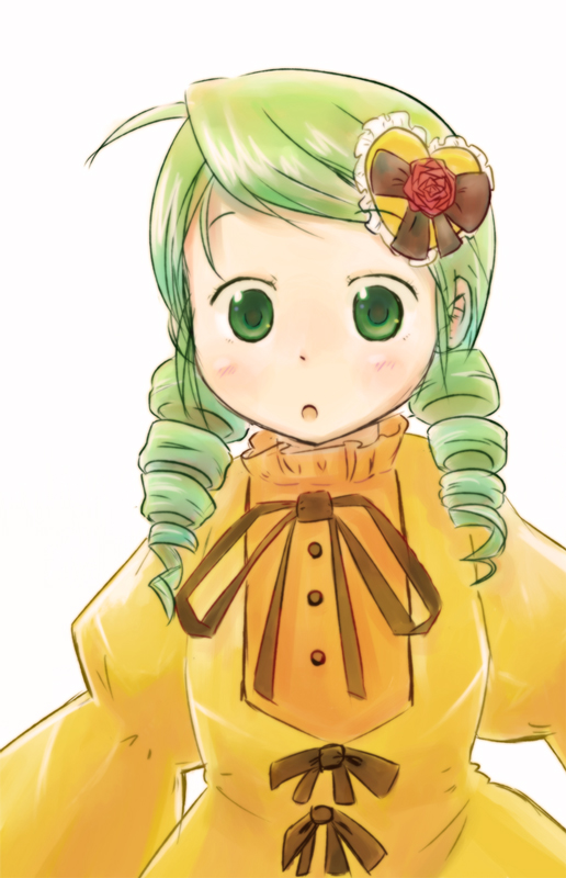 00s1girldressdrill hairfemale focusgreen eyesgreen hairhair ornamentmatching hair/eyesopen mouthsolo