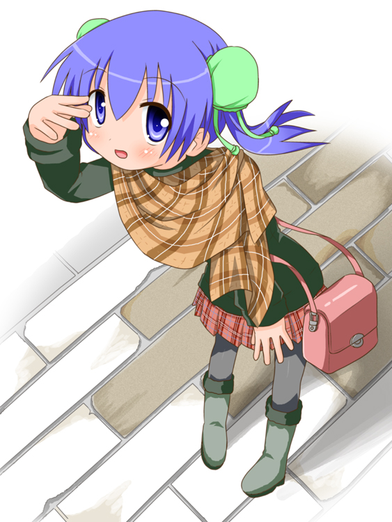 bagblue eyesblue hairbootsbun coverdouble bunhair bunhandbagpantyhoseplaid clothesplaid scarfplaid skirtpurple hairscarfskirtsolo