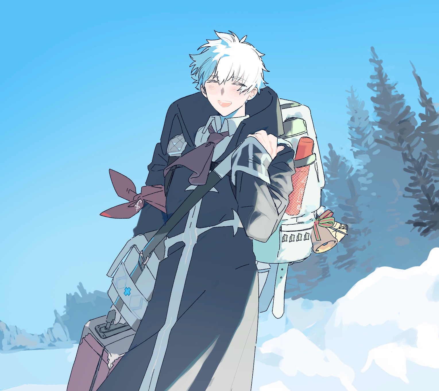 1boyarmbandascotbackpackbagbellblack coatblue skyclosed eyescoatcollared shirtdayfacing viewerfirst aid kithair between eyeshand upholdingholding suitcaselight blushlong sleevesmale focusopen mouthoutdoorspurple ascotred armbandshirtshort hairshoulder bagskysmilesnowsolosuitcaseteethtetota tettouthermostreewhite hairwhite shirt