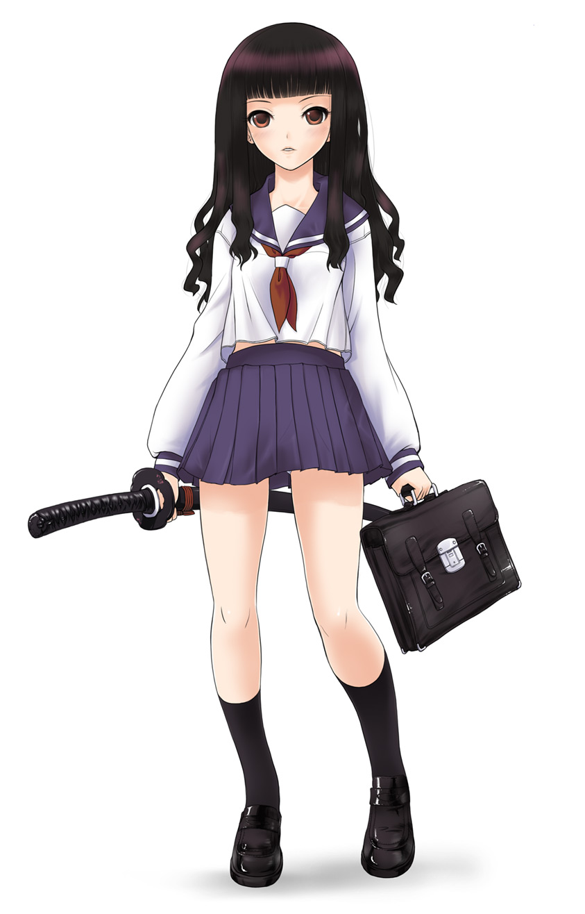 00sbagblack hairbrown eyeskatanalegslong hairsatchelschool bagschool uniformskirtsockssoloswordweapon