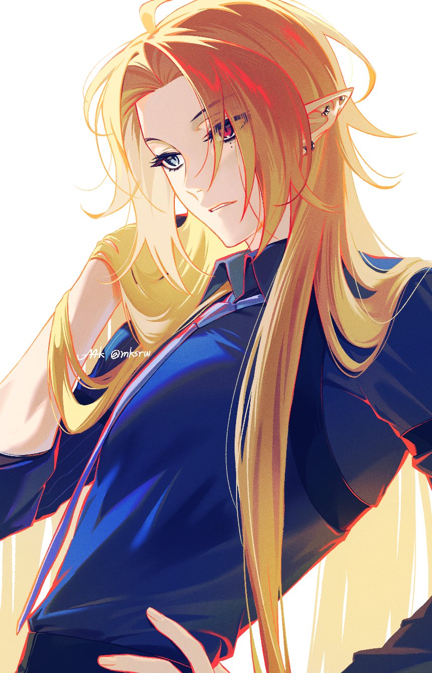 pan (ryu), dark magician girl, yu-gi-oh!, highres, 1girl, arm guards, bare shoulders, blonde hair, blue hat, blue shirt, blush stickers, breasts, cleavage, duel monster, green eyes, hair between eyes, hands on own hips, hat, jewelry, large breasts, long hair, looking at viewer, necklace, off-shoulder shirt, off shoulder, open mouth, pentacle, phrygian helmet, shirt, solo, white background