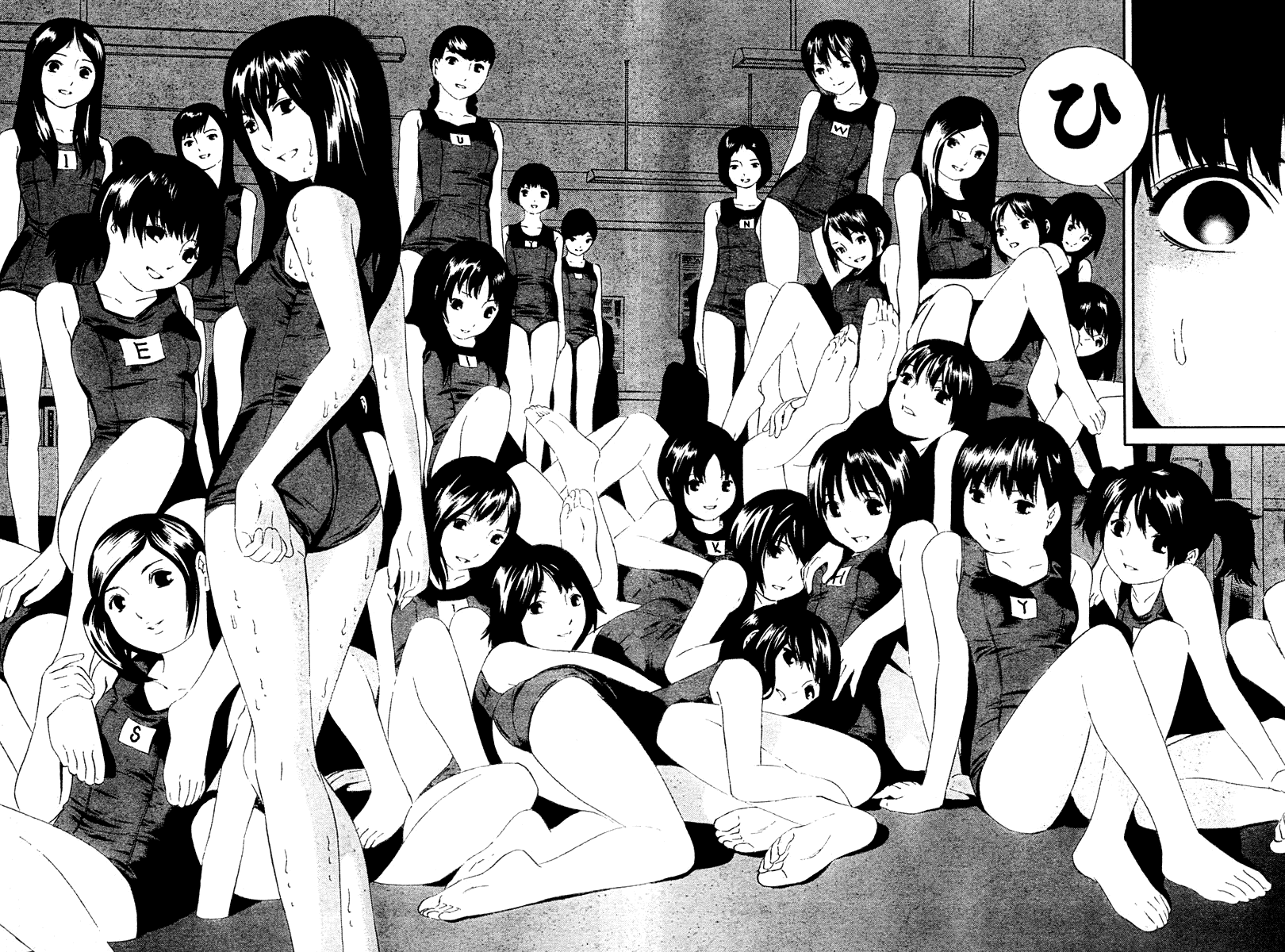 6+girlsbarefootcomiccrowdfeetflat chestgreyscalelegsmonochromemultiple girlsone-piece swimsuitschool swimsuitswimsuittoeswet