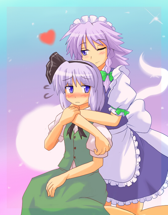 2girlsblue eyesblushfemale focushairbandhearthitodamahugmaidmultiple girlsone eye closedribbonshort hairwink