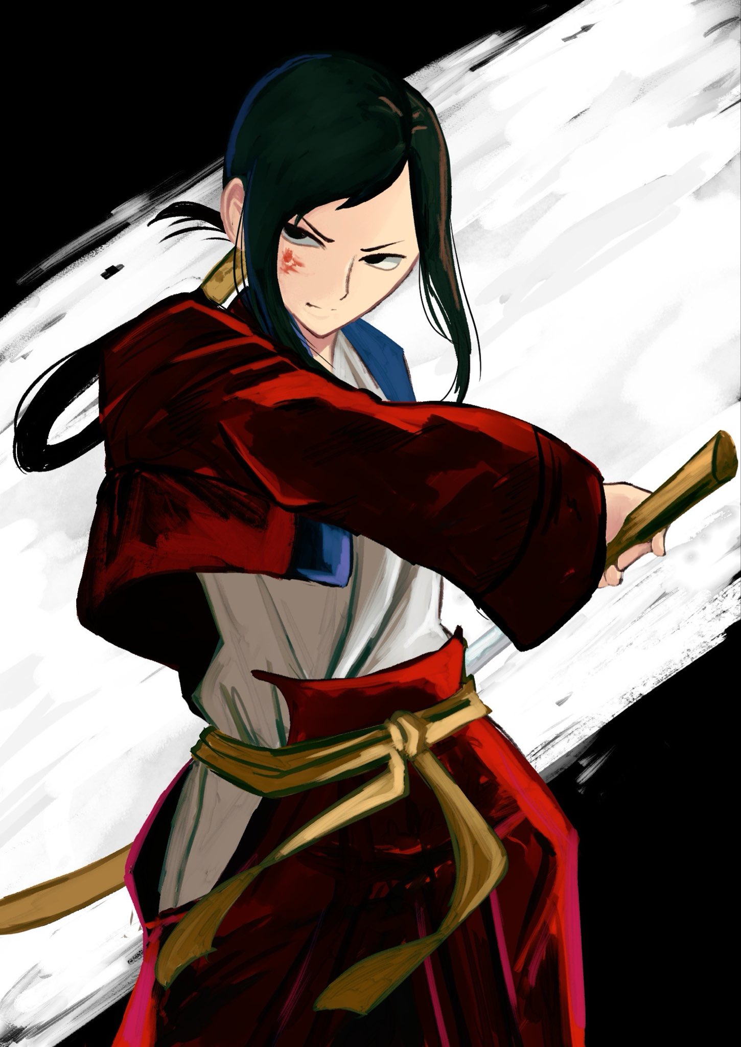 hakurei reimu, touhou, absurdres, highres, scan, 1girl, adapted costume, arm ribbon, ascot, black eyes, black hair, black ribbon, bow, collar, covering own mouth, detached sleeves, dress, female focus, flower, frilled bow, frilled shirt collar, frills, gohei, hair bow, hime cut, long hair, ofuda, red bow, red ribbon, ribbon, ribbon-trimmed clothes, ribbon-trimmed dress, ribbon-trimmed sleeves, ribbon trim, solo, white collar, white ribbon, white sleeves, yellow ascot, yellow ribbon
