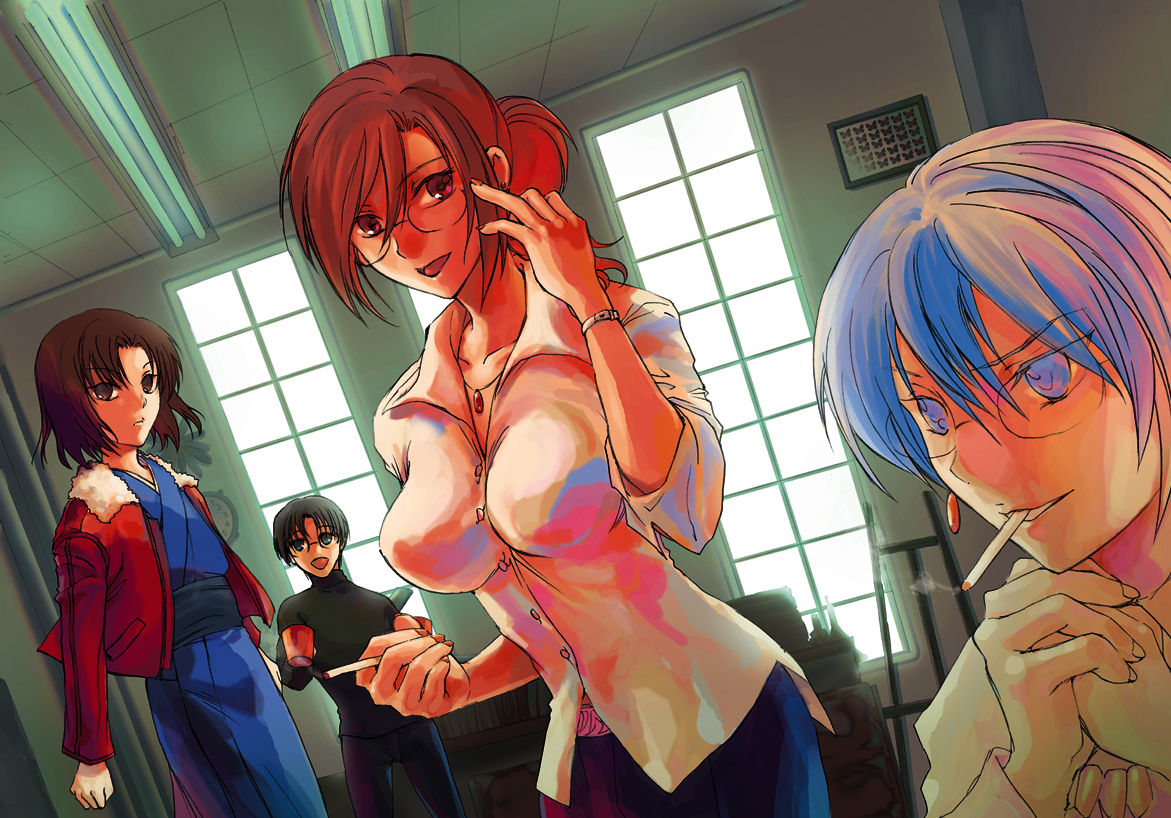breastscigarettedual personaglassesimpossible clothesimpossible shirtlarge breastsshirtsleeves rolled upsmilesmoking