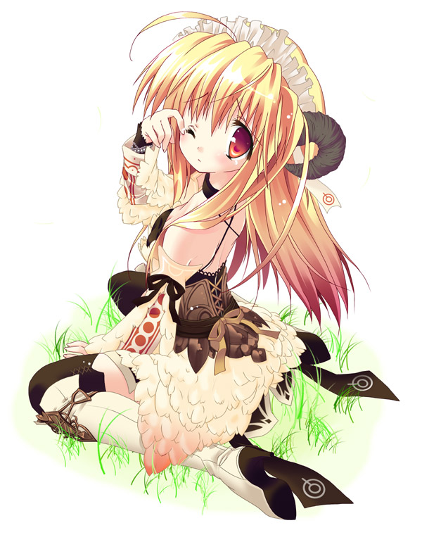 1girlantenna hairblonde hairfemale focusgrasshornslong hairone eye closedred eyessittingsolowink
