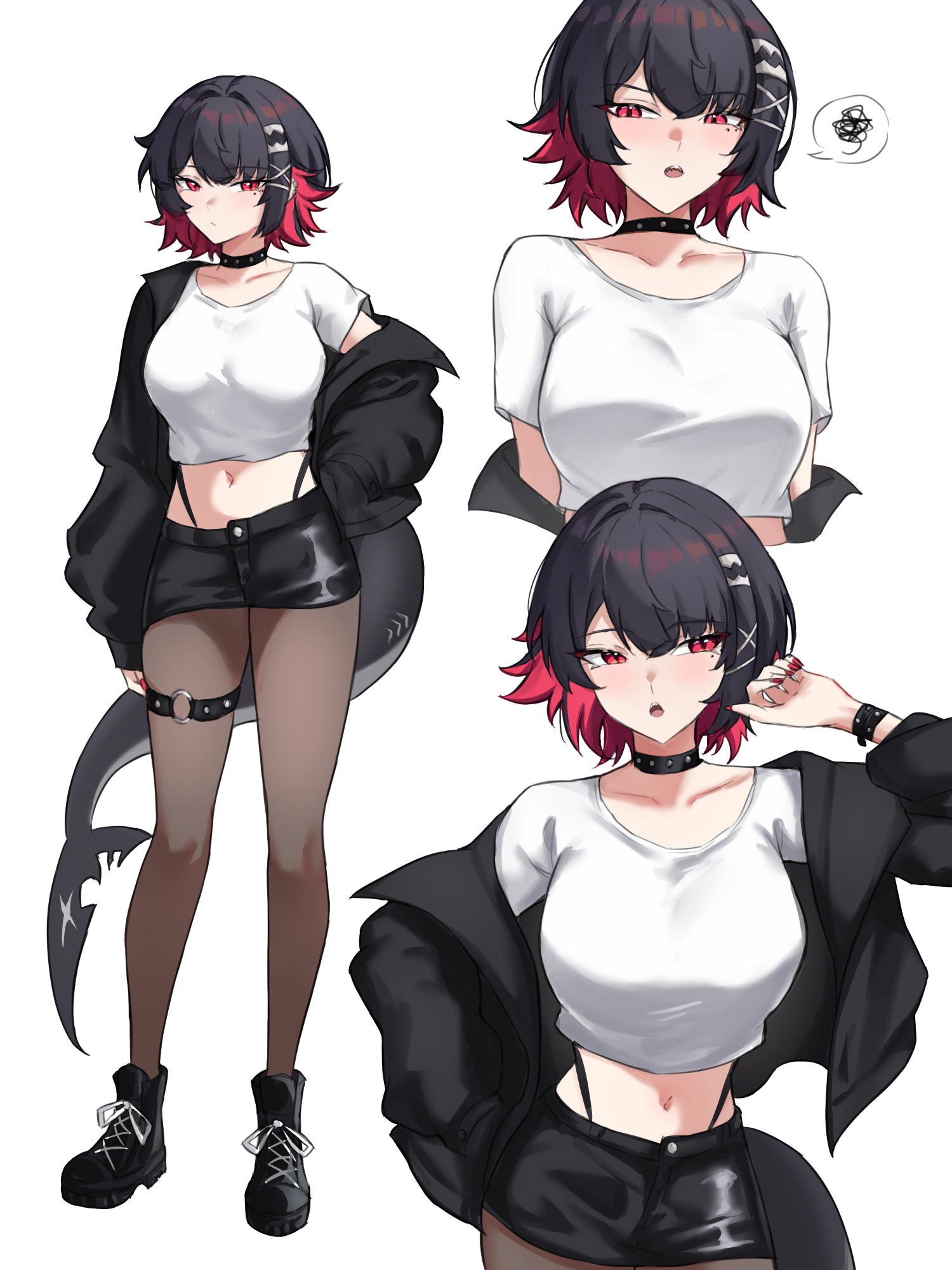 mizah (mizah), evernight (honkai: star rail), march 7th (honkai: star rail), march 7th (preservation) (honkai: star rail), stelle (honkai: star rail), trailblazer (honkai: star rail), honkai: star rail, honkai (series), absurdres, highres, 3girls, grey hair, kiss, kissing cheek, licking, licking another's cheek, licking another's face, long hair, multiple girls, pink hair, red eyes, short hair, simple background, white background, yellow eyes, yuri