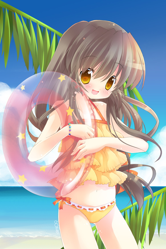 00s1girlbeachbikinibrown hairdayfemale focusinnertubelong hairorange eyesoutdoorssoloswim ringswimsuittankiniyellow bikini