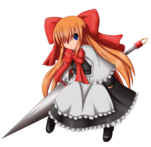 1girlblonde hairblue eyesdollfemale focusfull bodylancepolearmribbonsimple backgroundsolospearstandingweaponwhite background