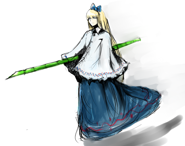 1girlbambooblonde hairblue eyesfemale focusfull bodypolearmribbonsolospearstandingweaponwhite background