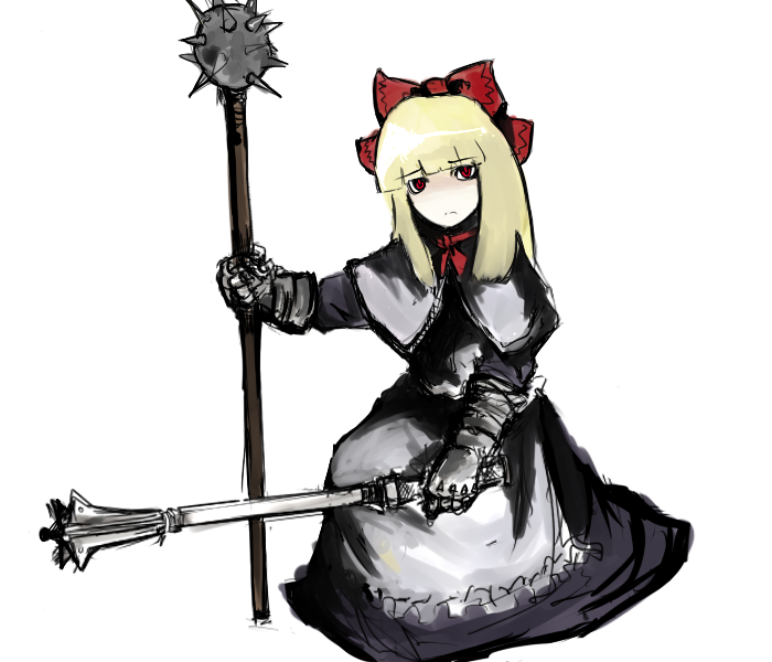 kikurage (plastic people), 1girl, armor, blonde hair, boots, breasts, cape, cleavage, fantasy, female focus, hip focus, large breasts, looking at viewer, solo, sword, thigh boots, thighhighs, weapon