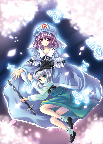 2girlsaqua eyesblunt bangsbob cutbobby socksbreastsbugbutterflycleavagefemale focushairbandinsectjapanese clotheskatanakimonolap pillowloaferslooking at viewermultiple girlsoutstretched handpink hairred eyesshoesshort hairsmilesocksswordweapon