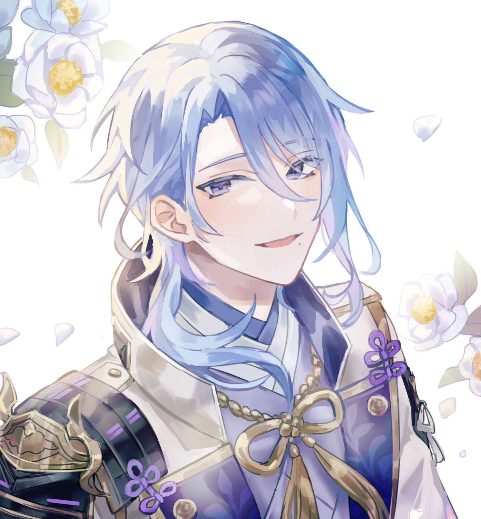hoshirube sho, hoshirube sho (2nd costume), otomo (hoshirube sho), nijisanji, highres, 1boy, aqua eyes, aqua hair, beret, blue hat, buttons, ch s pn, collared shirt, colored inner hair, diamond button, hat, holding, holding unworn clothes, long hair, looking at another, male focus, multicolored hair, official alternate costume, partially unbuttoned, purple hair, shirt, short hair, simple background, solo, two-tone hair, upper body, virtual youtuber, white background, white shirt