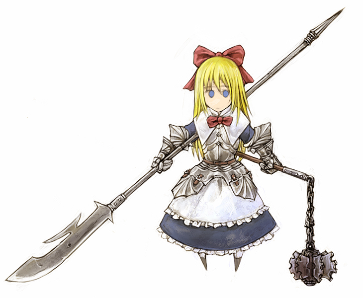 1girlarmorarmored dressball and chain (weapon)blonde hairblue eyesbowbowtiedressfemale focusflailhair ribbonpolearmribbonsoloweapon