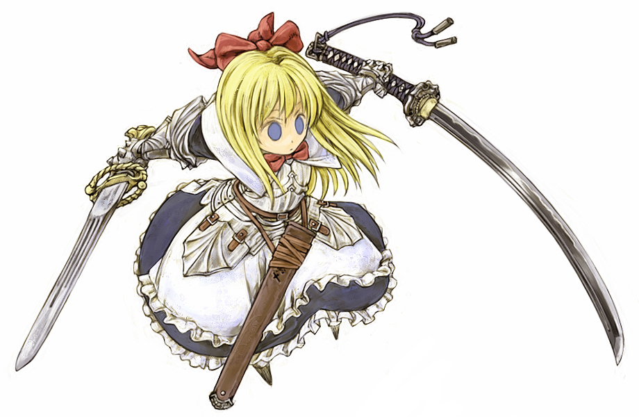 1girlarmorarmored dressblonde hairblue eyesdressdual wieldingfemale focusgauntletsholdingkatanaribbonscabbardsheathsoloswordweapon