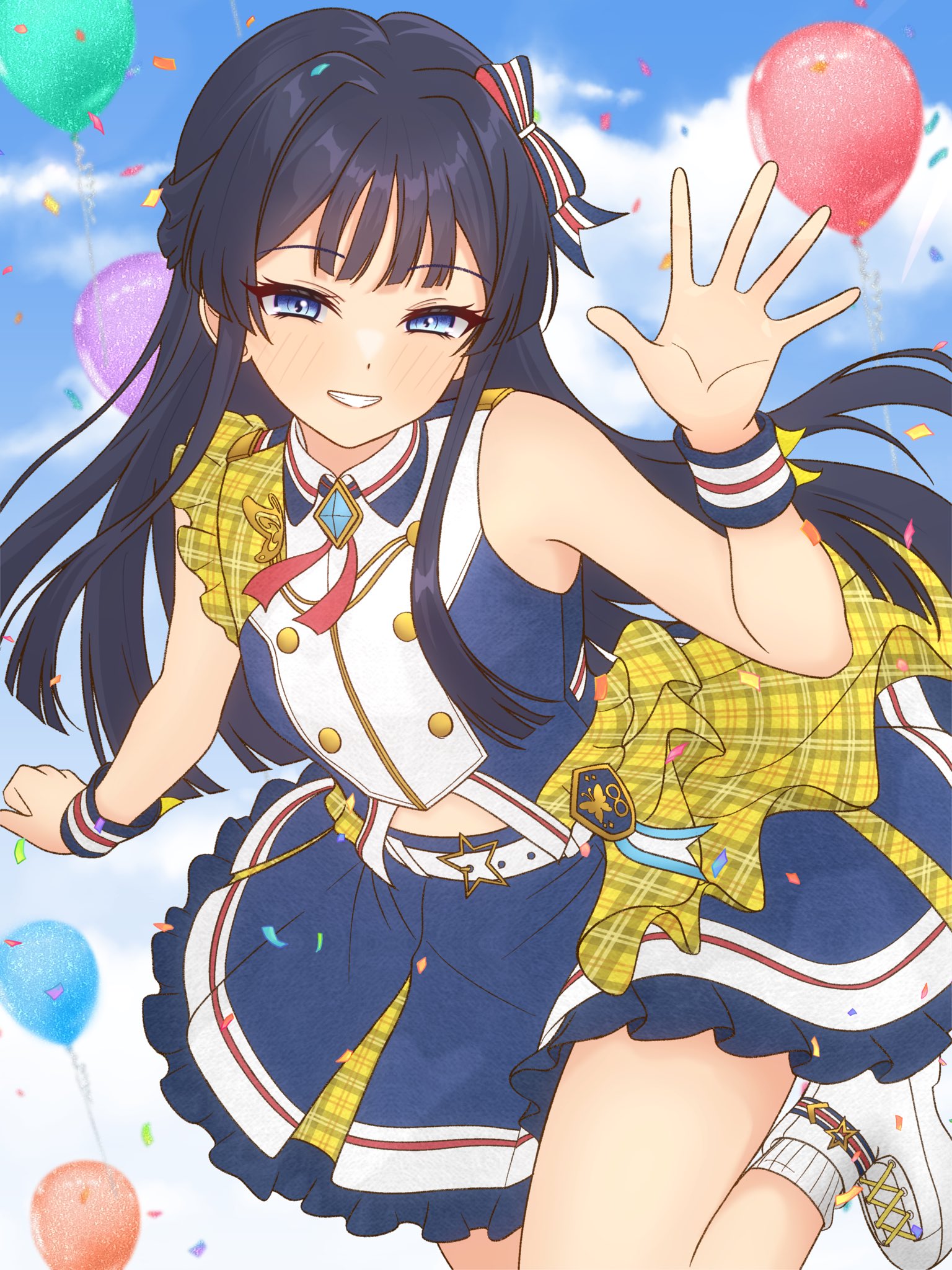 1girlballoonbeltblack hairblue eyesblue skirtblunt endsbootsbowconfetticreate festival (idolmaster)daygrinhair bowhand uplong hairlooking at viewermulticolored bowmulticolored skirtofficial alternate costumeoutdoorsplaid clothesskirtsleevelesssmilesolostriped clothesstriped wrist cuffswavingwhite beltwhite bootswrist cuffs