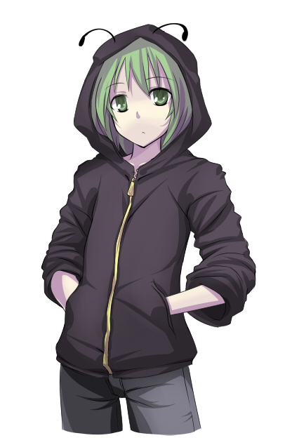 1girlalternate costumeandrogynousantennaecontemporaryfemale focusgreen hairhands in pocketshoodhooded jacketjacketreverse trapshort hairsimple backgroundsleeves pushed upsolowhite background