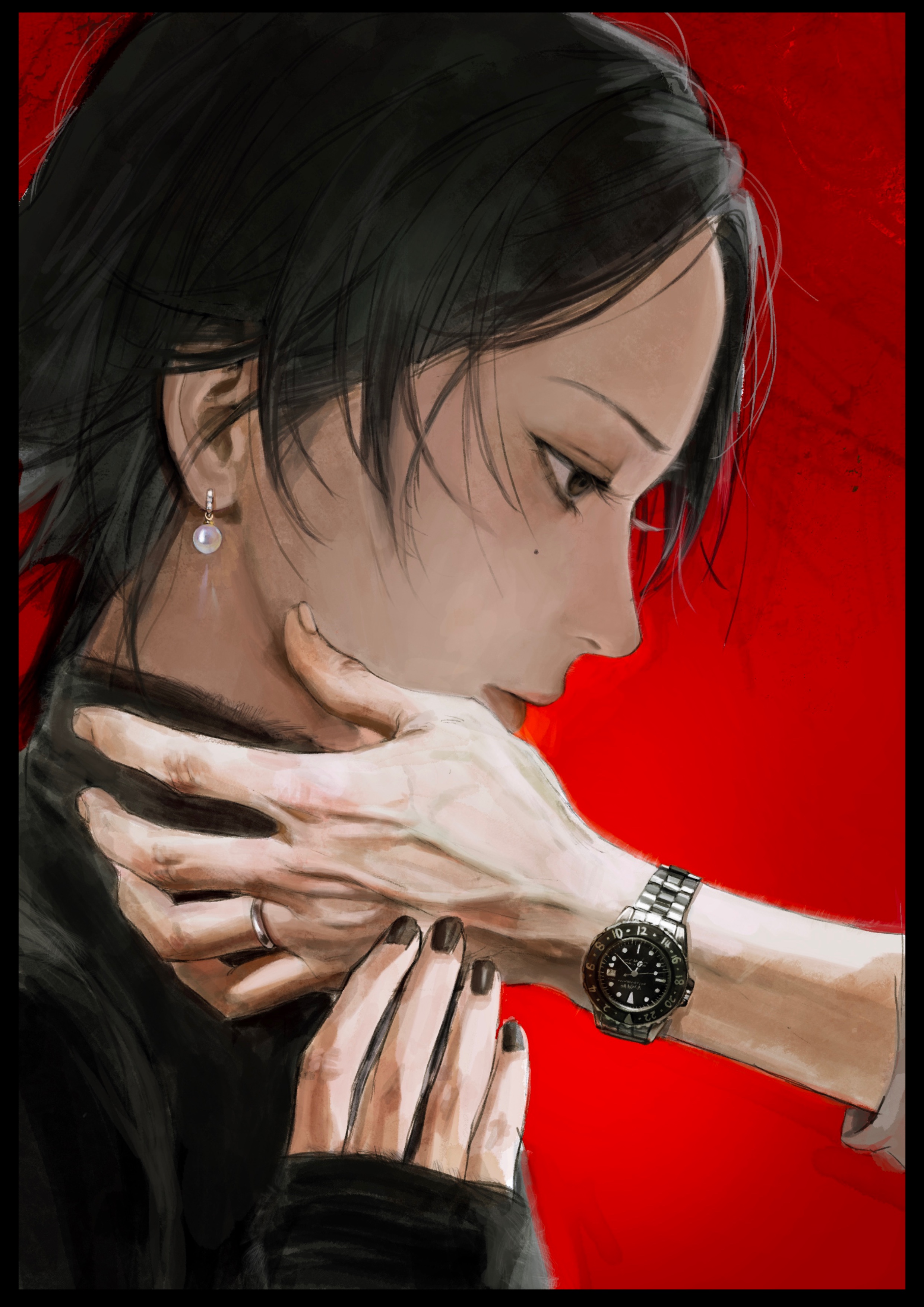 1boy1girlartist nameblack borderblack eyesblack hairblack nailsborderearringsexpressionlessfingernailsfrom sidejewelrymolemole on cheeknail polishout of frameportraitrealisticred backgroundringshort hairsimple backgroundsolo focuswatchwristwatch