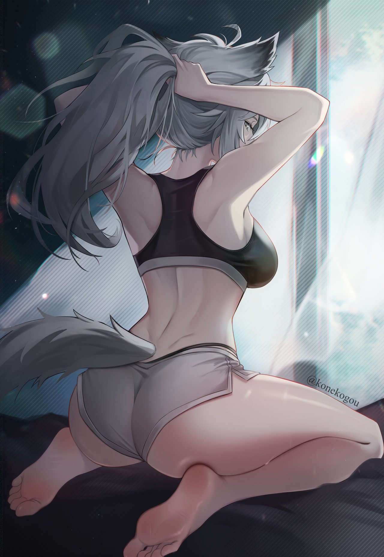 1girlanimal earsarms upassbackbare legsbarefootbed sheetblack sports bracurtainsdolphin shortseyelashesfeetfrom behindfull bodygrey hairgrey tailkonekogoulegslooking backmicro shortsshortssolessolosports bratailtoestwitter usernametying hairwolf earswolf girlwolf tail