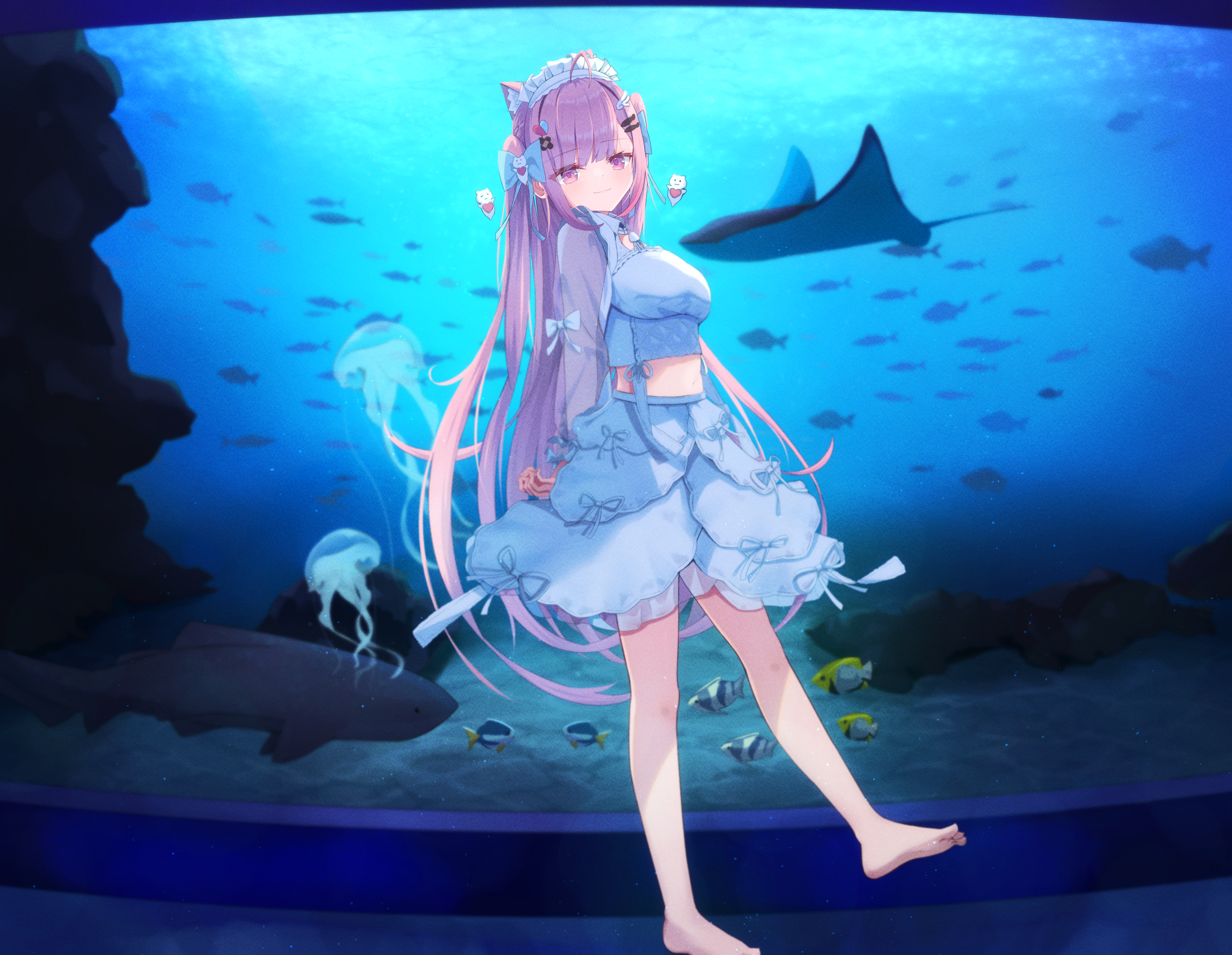 1girlanimal earsaquariumarms behind backbare legsbarefootblue backgroundblue bowblushbowbreastscat earsclosed mouthdresseyelashesfeetfishfrilled hairbandfrillsfull bodyhair bowhair ornamenthairbandhairclipjellyfishlong hairlooking at viewermaid headdressmedium breastsmidriffpink eyespink hairsee-through clothessee-through sleevessharksolessolostandingstanding on one legstingraytoesvery long hairvirtual youtuberwaterwhite dress