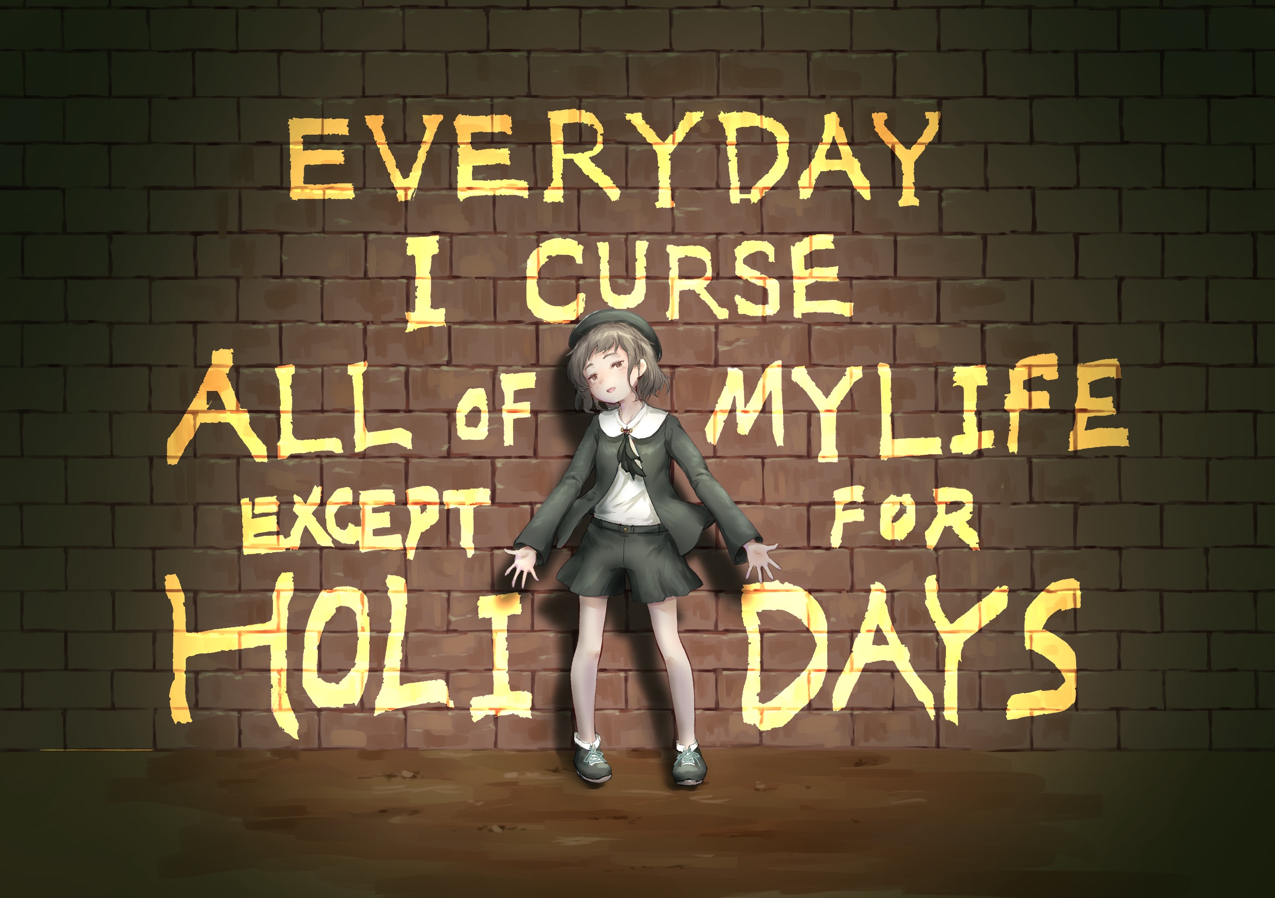 1girlalternate costumeberetblack hatblack jacketblack ribbonblack shoesblack shortsbrick wallbrown eyesbrown hairenglish textgraffitihatjacketlong sleeveslooking at viewerneck ribbonopen handsopen mouthribbonshirtshoesshort hairshortssmilesneakerssolospotlightstandingwhite shirtwide shot