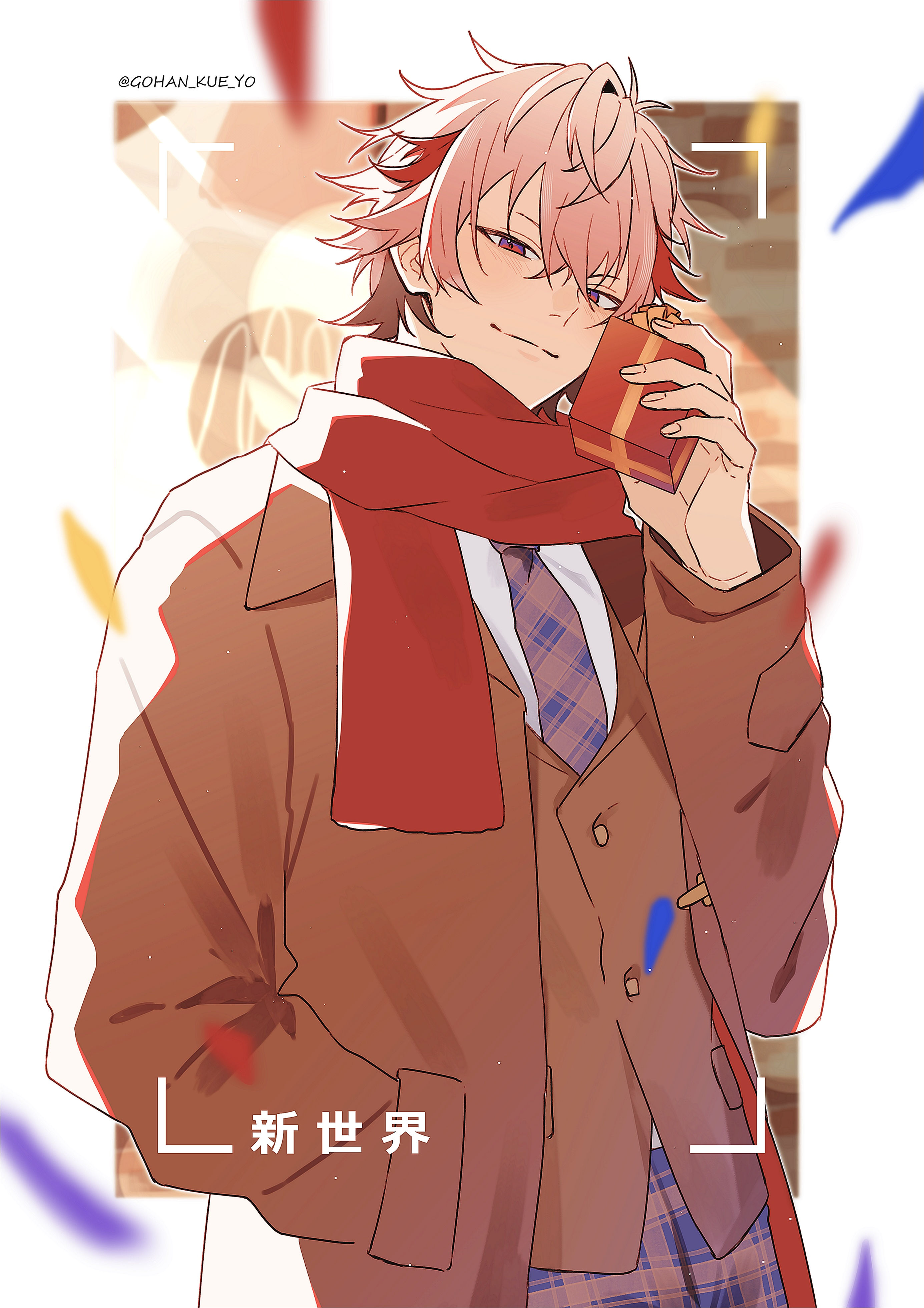 1boyalternate costumeblue necktieblue pantsblurryblurry foregroundbokehborderbrown backgroundbrown jacketbrown necktiebrown pantsbrown vestconfettidepth of fieldflipped hairgifthand in pocketholdingholding giftjacketlong sleeveslooking at viewermale focusmulticolored hairnecktiepantspink hairplaid clothesplaid necktieplaid pantsred eyesred hairred scarfscarfshirtshort hairsmilesolostreaked hairtwitter usernamevestvirtual youtuberwhite borderwhite shirt