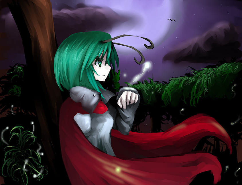 1girlantennaebugcapefemale focusfirefliesfireflygreen eyesgreen hairmatching hair/eyesnightshort hairsolo