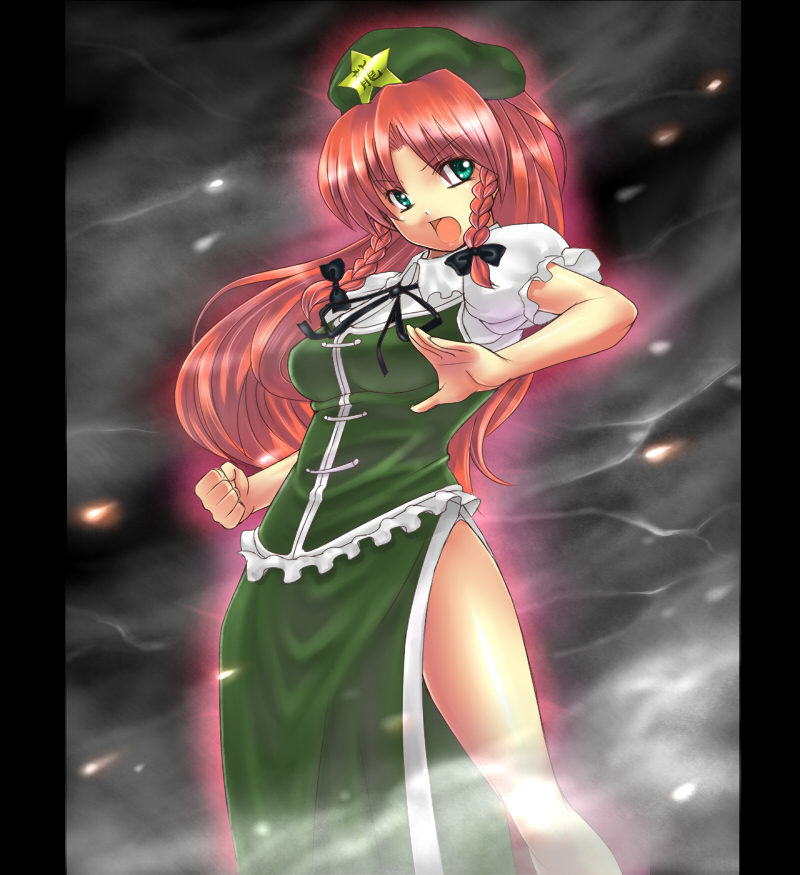 1girlbraidchina dresschinese clothesdressfemale focusfighting stancehatlong hairpillarboxedred hairsolotwin braids