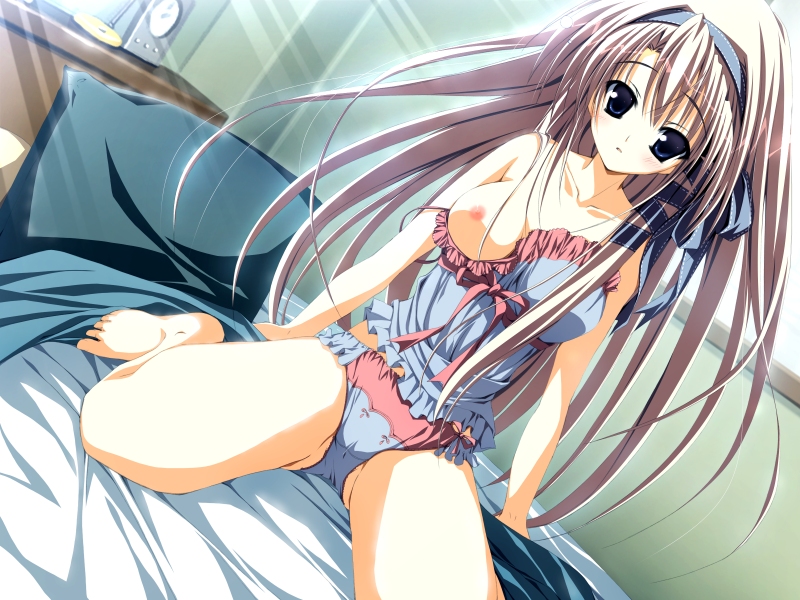 1girlbedblue eyesblue pantiesbreast slipbreastsclothes pulldutch anglegrey hairhair ribbonlarge breastslong hairnipplesno braone breast outpantiespillowribbonshirt pullsittingspread legsunderwearvery long hairwariza