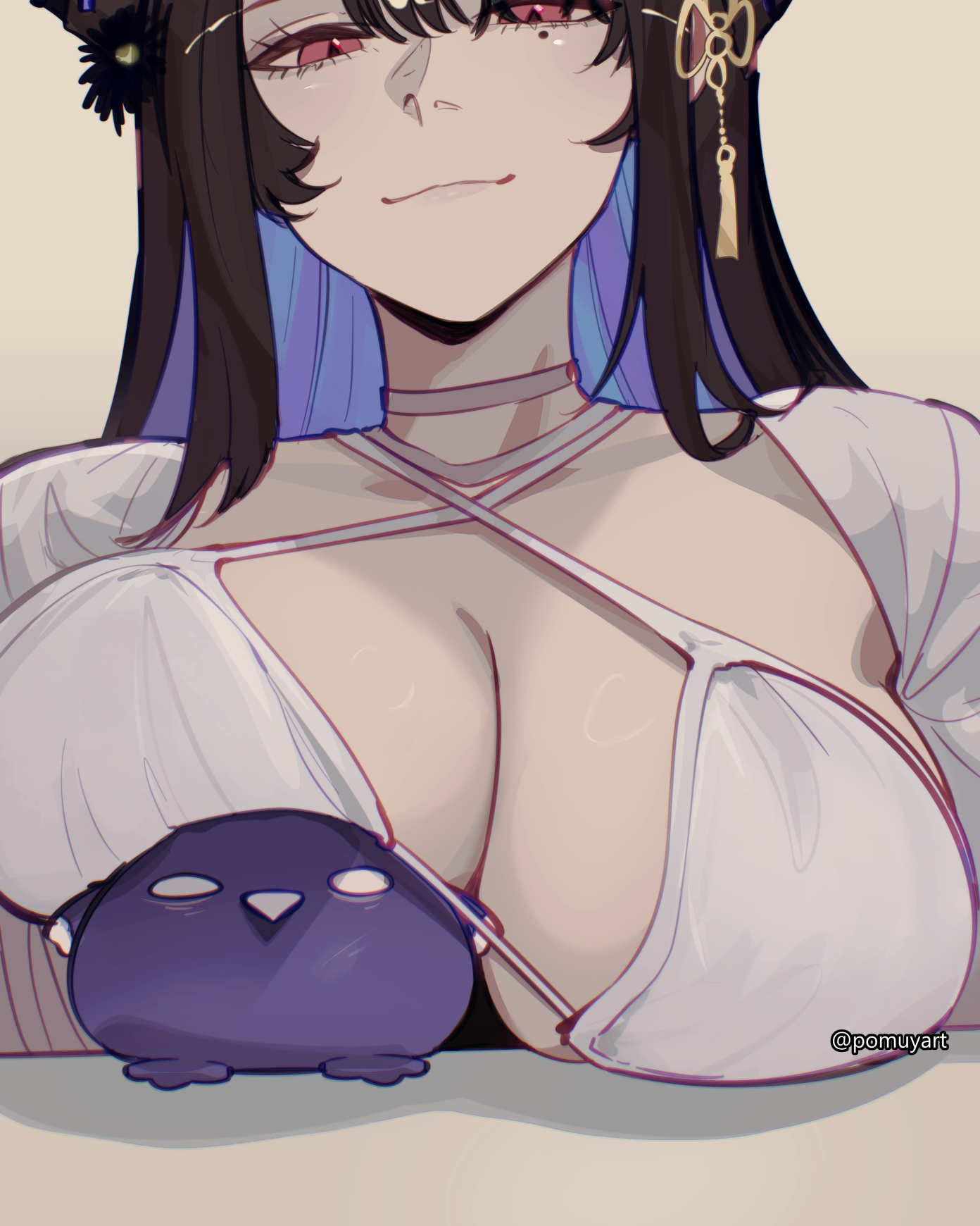 :31girlblack hairblue hairbreast restbreastsbreasts on tablechokercleavageclosed mouthcolored inner haircriss-cross halterdouble-parted bangsflowerflower knothair between eyeshair flowerhair ornamenthalterneckhead out of framelarge breastsmememisanay1 breast rest (meme)molemole under eyemulticolored hairpurple eyesshirtslit pupilssolostraight hairtasseltassel hair ornamentvirtual youtuberwhite chokerwhite shirt