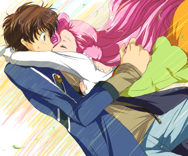 athrun zala, cagalli yula athha, gundam, gundam seed, gundam seed destiny, 00s, 1boy, 1girl, ^ ^, blonde hair, blue hair, blush, bracelet, closed eyes, green eyes, hetero, hug, hug from behind, jewelry, long sleeves, short hair, signature, simple background, smile, upper body