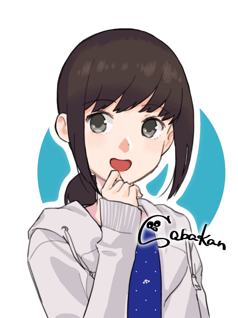 :d1girlanchor symbolblue backgroundblue dressbrown hairdrawstringdressgrey eyesgrey jackethand uphoodhood downhooded jacketjacketlong sleeveslooking at viewerlow ponytailmedium hairofficial alternate costumeone-hour drawing challengeopen clothesopen jacketopen mouthoutlinepolka dotpolka dot dressponytailsabakanbasupisusidelockssignaturesimple backgroundsleeves past wristssmilesoloupper bodywhite backgroundwhite outline