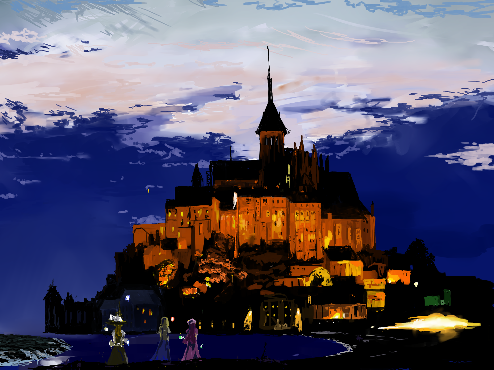 3girlsarchitectureblonde haircastlefemale focusgothic architecturehatmont st-michelmultiple girlspurple hairscenerywitchwitch hat