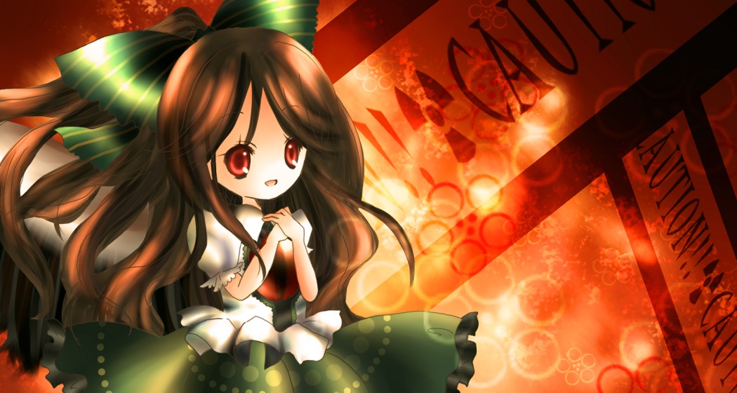 1girlblack wingsbrown haircautionfemale focusradiation symbolradioactivered eyesribbonskirtsolowings