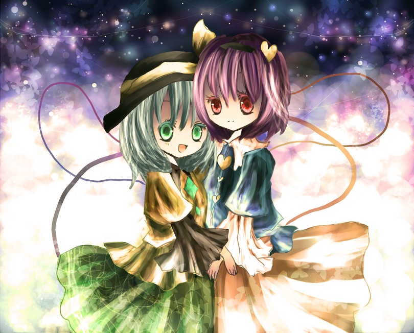 2girlsbugbutterflyfemale focusgradient backgroundgreen eyeshathearthuginsectmultiple girlspurple hairred eyesribbonshort hairsiblingssistersskirt