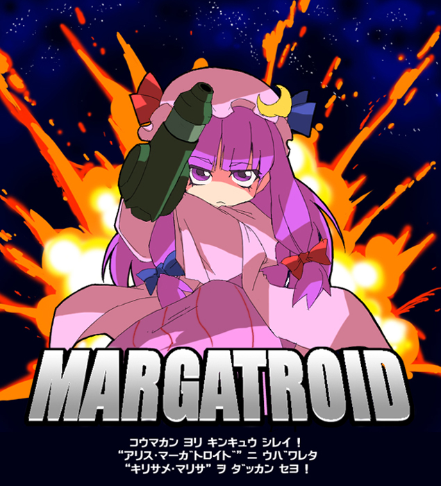 1girlbowcrescentcrescent hat ornamentenglish textexplosionfemale focushathat ornamentlong hairparodypurple eyespurple hairribbonsolo