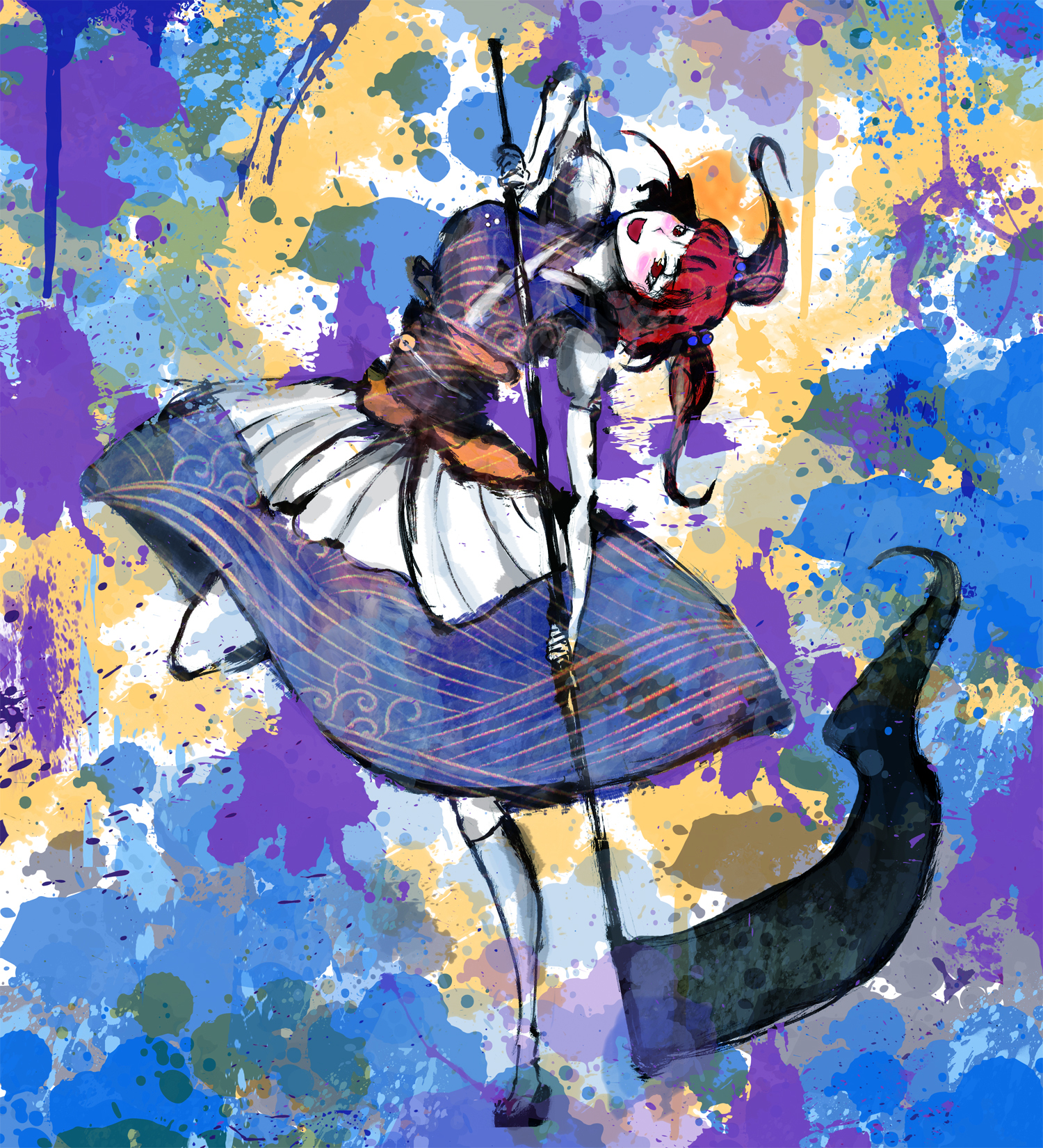 yorange17, hinanawi tenshi, touhou, absurdres, commentary, highres, 1girl, alternate costume, armor, belt, blue hair, breastplate, brown belt, closed mouth, fire, flaming sword, flaming weapon, gauntlets, holding, holding sword, holding weapon, long hair, no headwear, purple skirt, red eyes, skirt, solo, sword, sword of hisou, unsheathed, very long hair, weapon