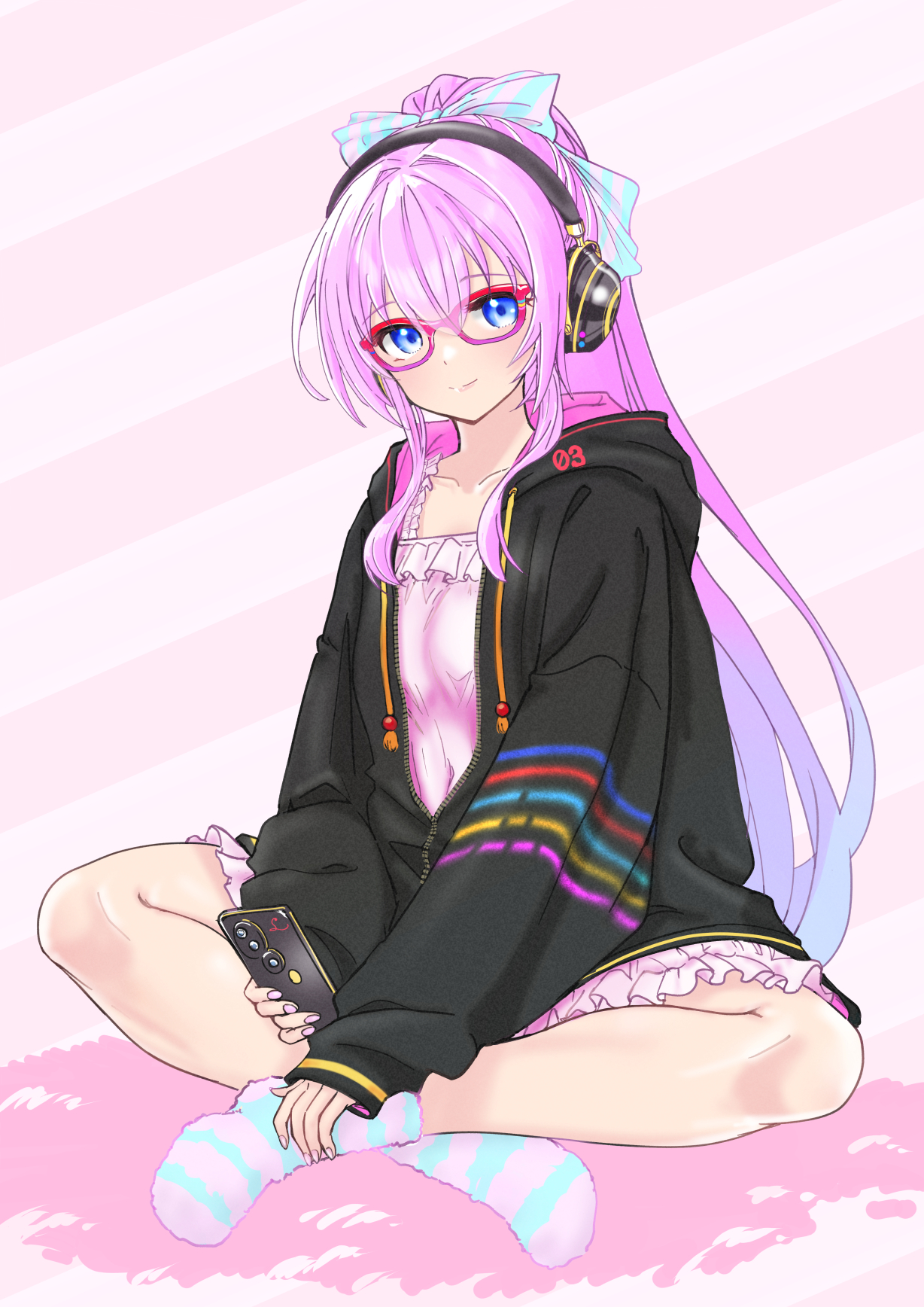 1girlblack hoodieblue eyesclosed mouthcollarbonefull bodyfuzzy clothesglassesgradient hairhair ribbonheadphonesholdingholding phonehoodhood downhoodieindian stylelong hairlong sleeveslooking at viewermulticolored hairno shoesopen clothesopen hoodiephonepink hairpink-framed eyewearribbonsidelockssittingsleeves past wristssmilesockssolostriped clothesstriped socks
