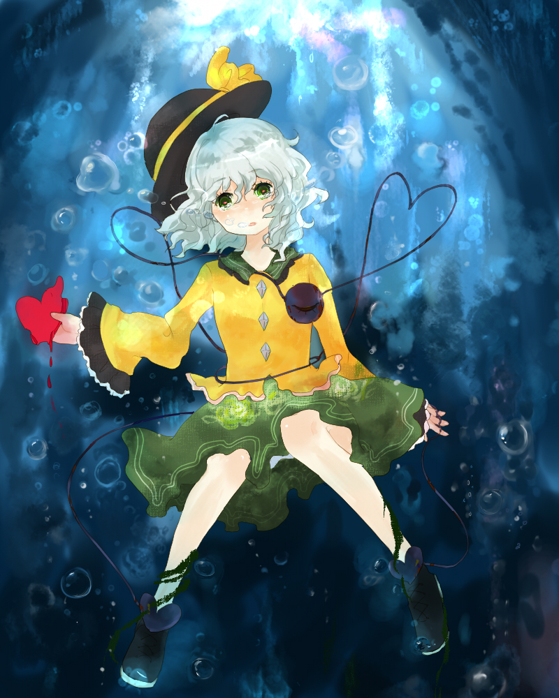 1girlbubblefemale focusgreen eyeshatheartheart of stringsolotearsunderwaterwetwet clotheswhite hair