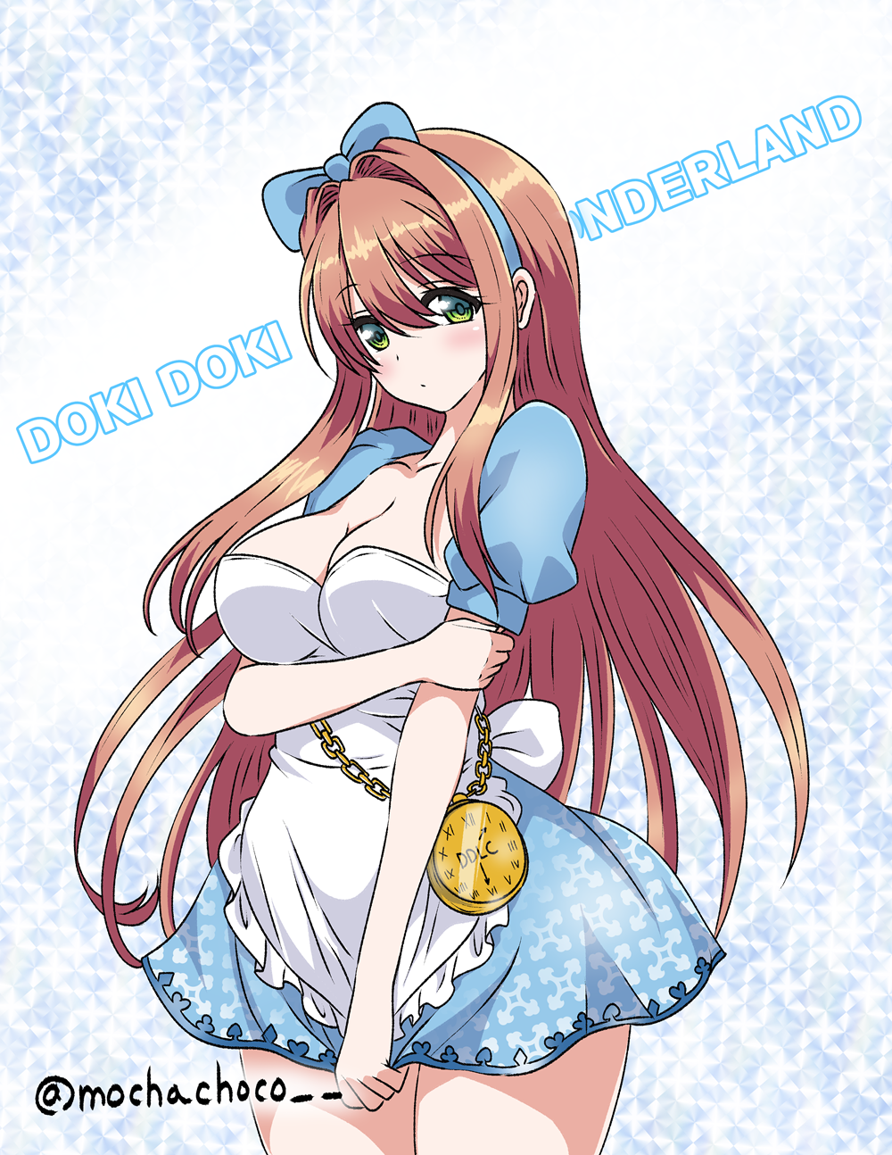 1girlapronblue bowblue dressblushbowbreastsbrown hairchaincleavageclosed mouthclothes pullcollarbonecosplaydot mouthdressdress pullgreen eyeshair between eyeshair bowlarge breastslong hairlooking at viewerpocket watchsidelockssolostandingtwitter usernamevery long hairwatchwhite apronwhite background