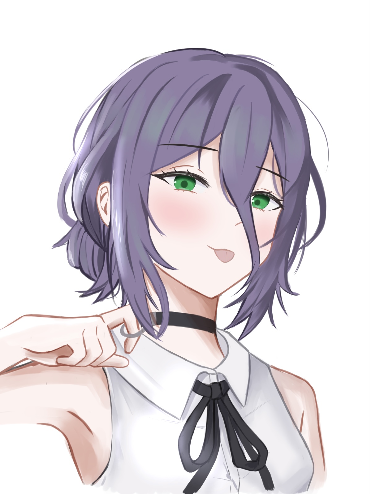1girlblack chokerblack ribbonchokercollared shirtgreen eyesgrenade pinhair between eyeslooking at viewerneck ribbonpurple hairribbonschontakushirtsimple backgroundsolotonguetongue outwhite backgroundwhite shirt
