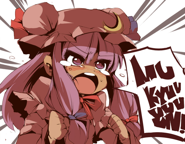 1girlangryclenched handscrescent hat ornamentemphasis linesfemale focushathat ornamentlong hairmukyuupurple eyespurple hairribbonromaji textsolotears