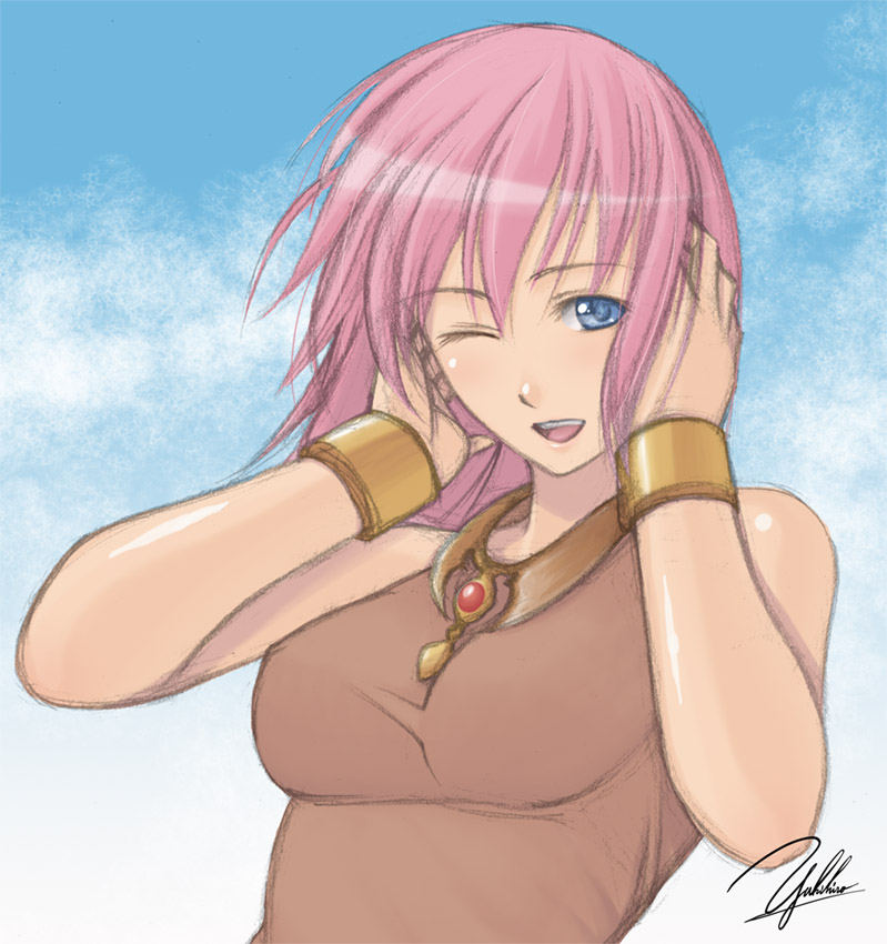 milleoxox, ace trappola, twisted wonderland, commentary request, highres, 1boy, arm up, arm warmers, black nails, chain, chain necklace, closed mouth, crew neck, double-parted bangs, facial mark, goggles, goggles on head, hair between eyes, heart, jewelry, looking to the side, male focus, messy hair, nail polish, necklace, one eye closed, orange hair, print shirt, red eyes, ring, sanpaku, shirt, short hair, sideways glance