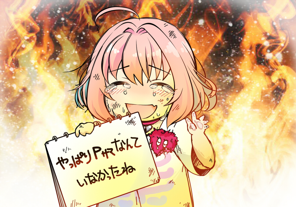 1girlblushclosed eyescollarcryingfacing viewerfangfirehaichu (user ayev2425)holdingholding notepadlight particlesmessy hairnotepadopen mouthparodyperilpink hairsadsad smileshirtshort hairskin fangsoloupper bodywavingwhite shirt