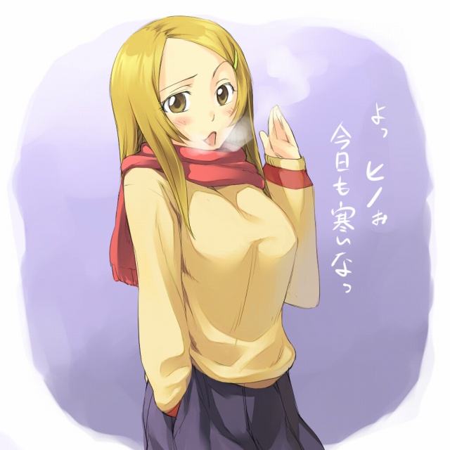 1girlblushbreathbrown eyesbrown haircoldfemale focushair ornamenthaircliplong hairscarfskirtsolosweaterwaving