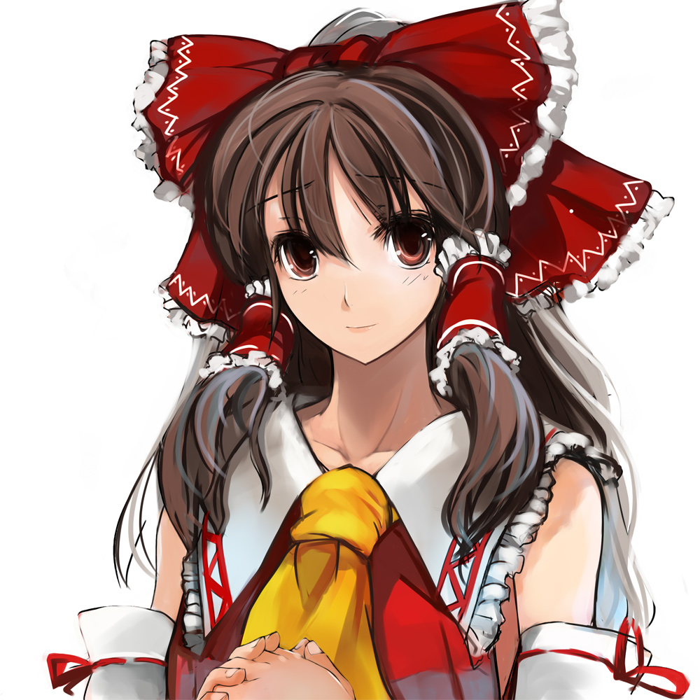 1girlascotbare shouldersbowbrown eyesbrown hairdetached sleevesfemale focushair bowhair tubesjapanese clotheslight smilelong hairlooking at viewermikoown hands claspedown hands togetherred eyesshirtshysmilesoloupper bodywhite background